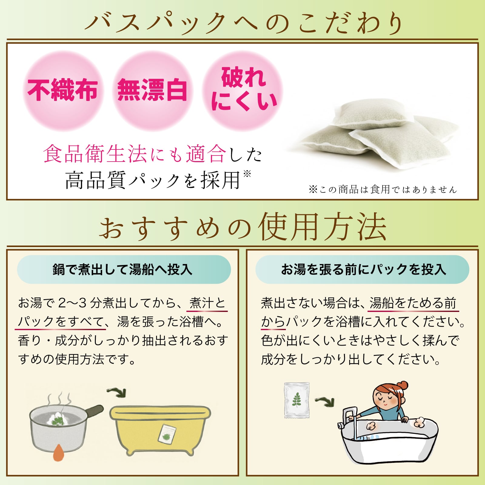 お湯で2〜3分煮出してから浴槽へ入れると、 香り・成分がしっかり抽出されます。 煮出さない場合は、 湯船をためる前からパックを浴槽に入れてください。 色が出にくいときはやさしく揉むと出ます。からだの気になる部位には直接パックを当ててください。