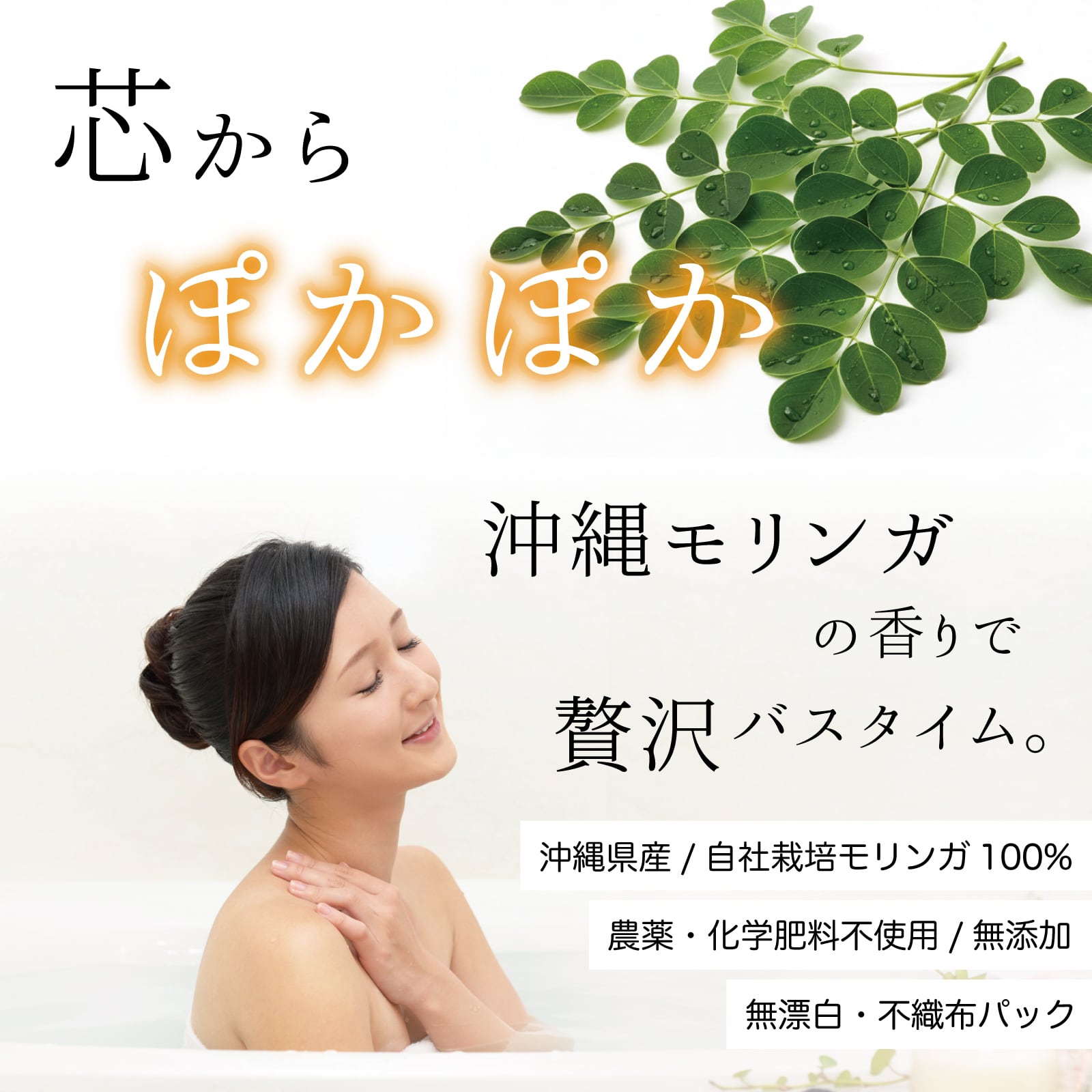 湯船に浮かべるだけで、沖縄モリンガの穏やかな香りが浴室いっぱいに広がり、心身を深く癒します。芯から温まる「ポカポカ」感のある温活時間。一日の終りに肩や首の力を抜きリラックス、睡眠前の質の高い時間を提供します。モリンガが肌のキメを整えるサポートをし、入浴後の肌もしっとり。