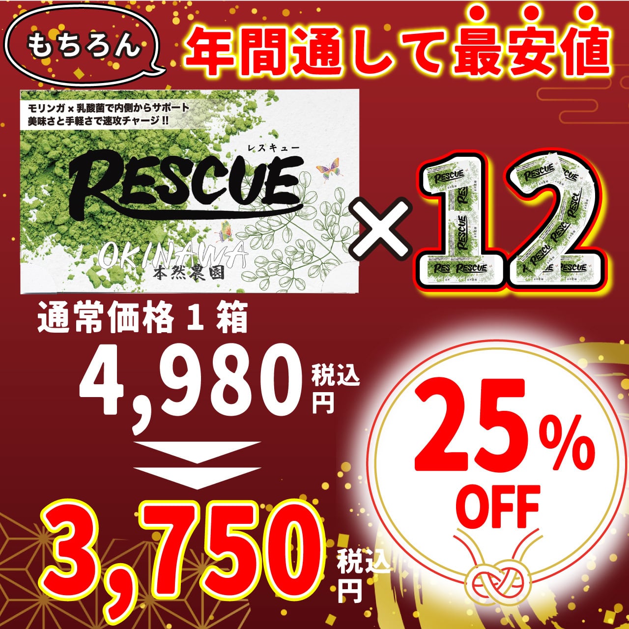 この福袋には、本然農園の一番人気商品オリジナルモリンガ青汁「RESCUE」が12箱(360本)入っており、
