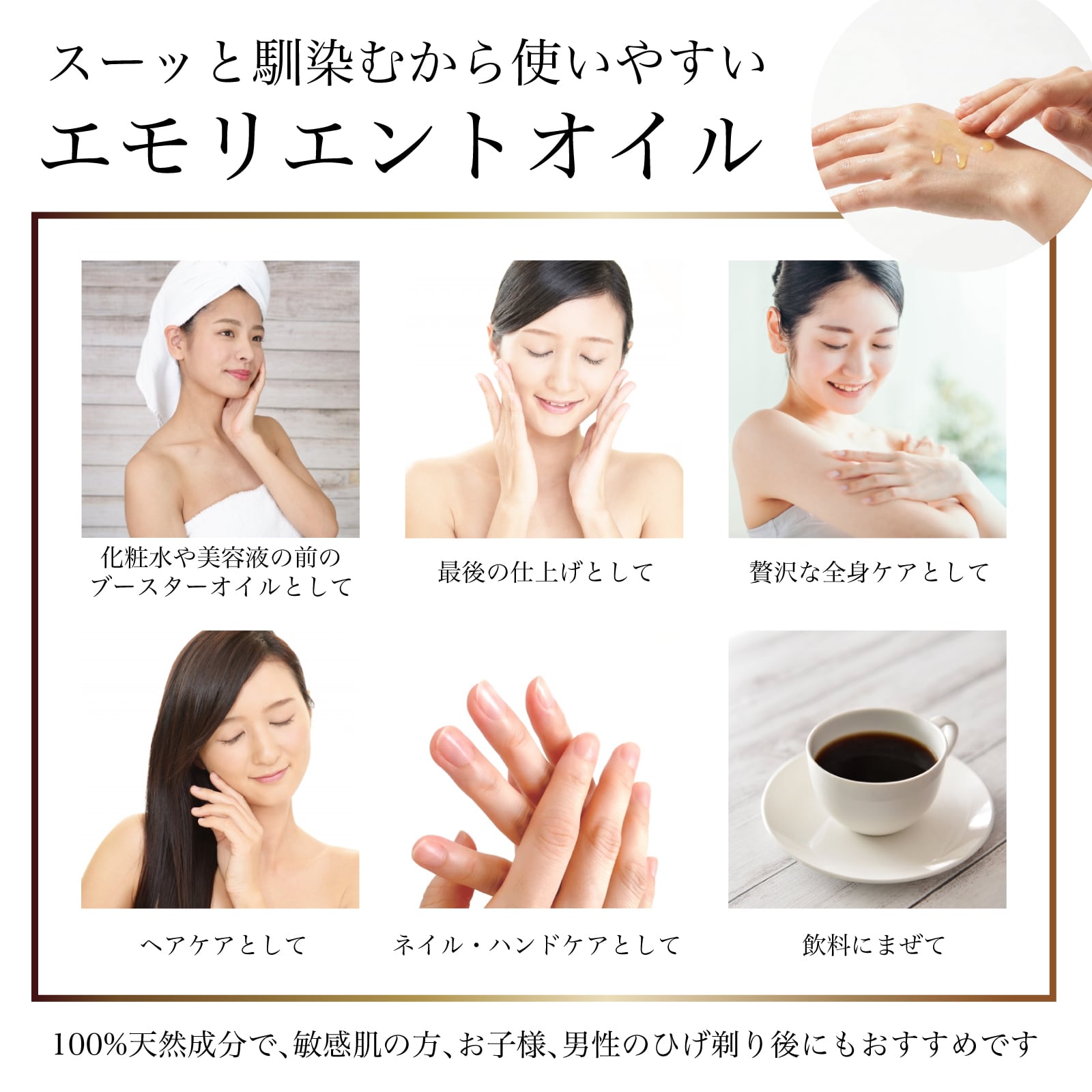 顔の保湿はもちろん、パサつく髪の毛先やボディケア、髭剃り後のアフターシェーブとしても最適。刺激が少なく肌に優しいので、小さなお子様から大人まで、ご家族全員のデイリーケアとして幅広く活躍します。