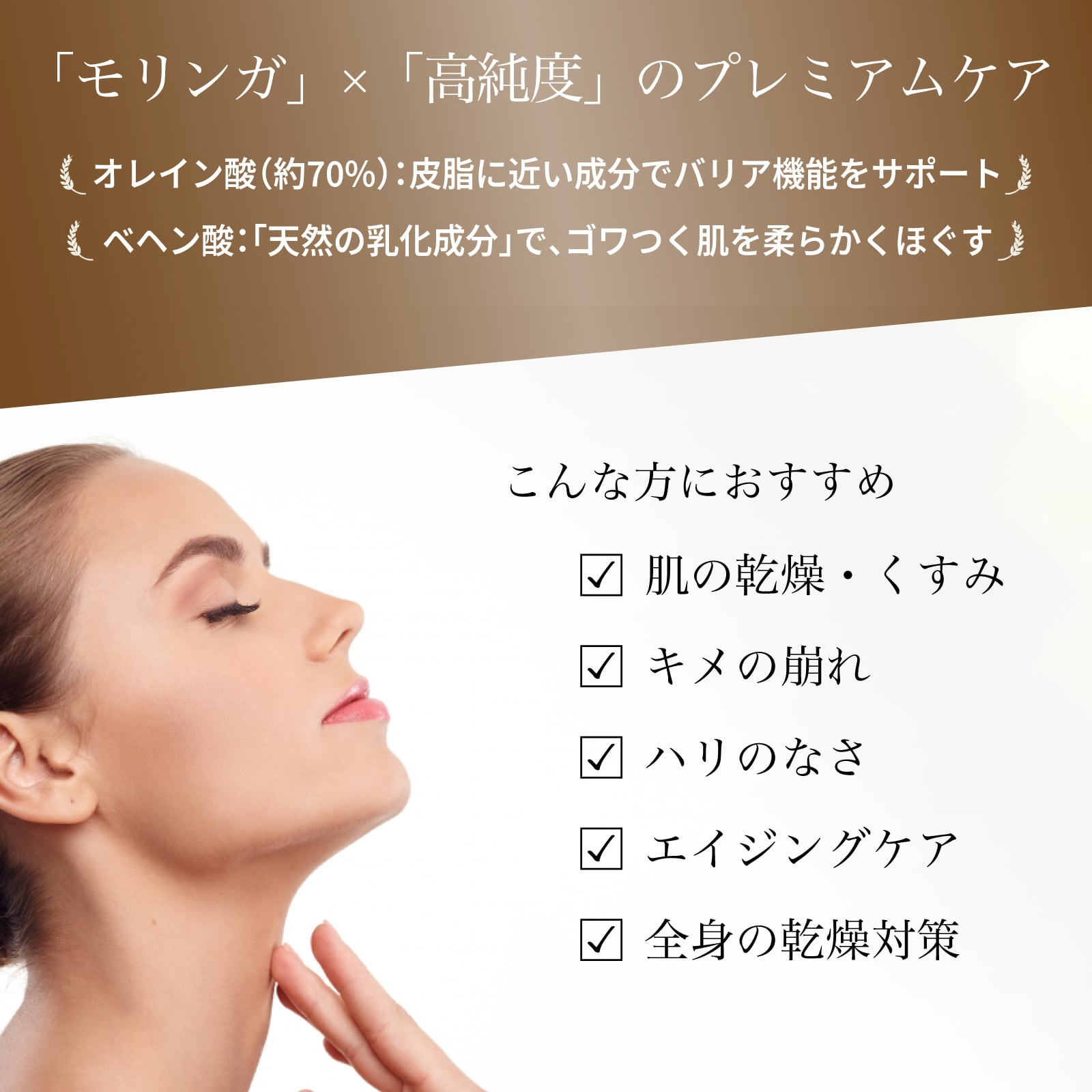 このモリンガオイルは、USDAオーガニック認証を受けた高品質な種子のみを使用し、熱を加えない「コールドプレス(低温圧搾)製法」で丁寧に抽出しています。そのため、美容成分であるオレイン酸や、天然の乳化成分と呼ばれるベヘン酸を壊すことなく、フレッシュな状態でお肌に届けることができます。