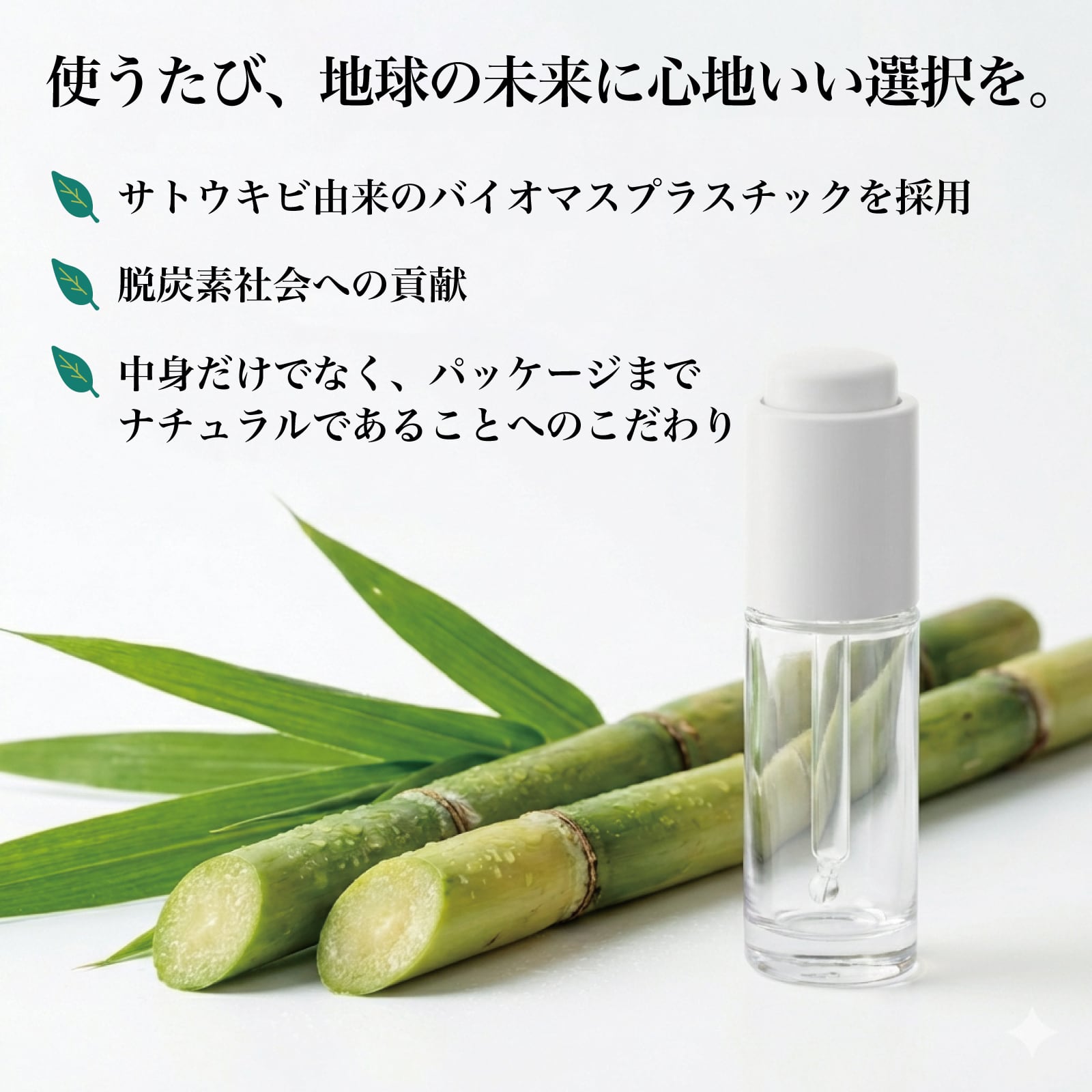 毎日使うものだから、環境への優しさにもこだわりました。容器にはサトウキビを原料としたバイオマスプラスチックを採用。CO2排出削減に貢献し、サステナブルなライフスタイルをサポートします。